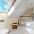 Upstairs there is a second bathroom and a snug/sitting area with sea views. The bathroom has a bath with shower over, a toilet, handbasin and heated towel rail. The snug has a sofa, TV, reading lamps and a window that opens fully to let the sea air drift in.