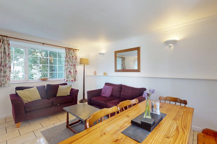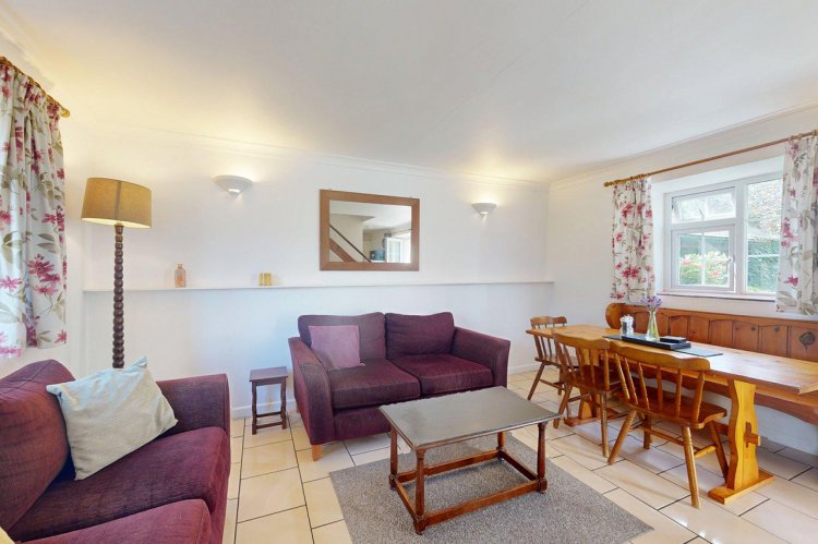 Outside, the rear patio has a bench just outside the door, leading onto a larger lawned garden shared with the neighbouring cottage. There is plenty of space for families to relax, along with picnic benches for outdoor dining.