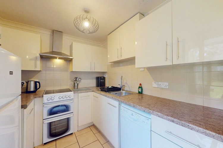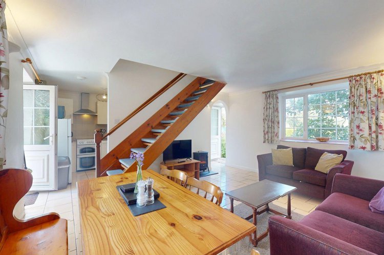 From the parking area, enter into the tiled ground floor living and dining room, with the kitchen just off.