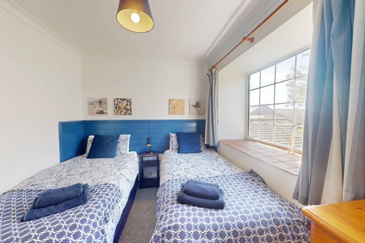 Barn Cottage accommodates up to five guests across three bedrooms. To the front is a mature garden, while the real highlight lies just beyond the back door, where a sun-trap patio leads onto a larger garden with apple trees and vibrant buddleia. Located close to the coast path, with local beaches and Mullion village within easy reach, it makes a well-placed base for exploring this part of the Lizard Peninsula.