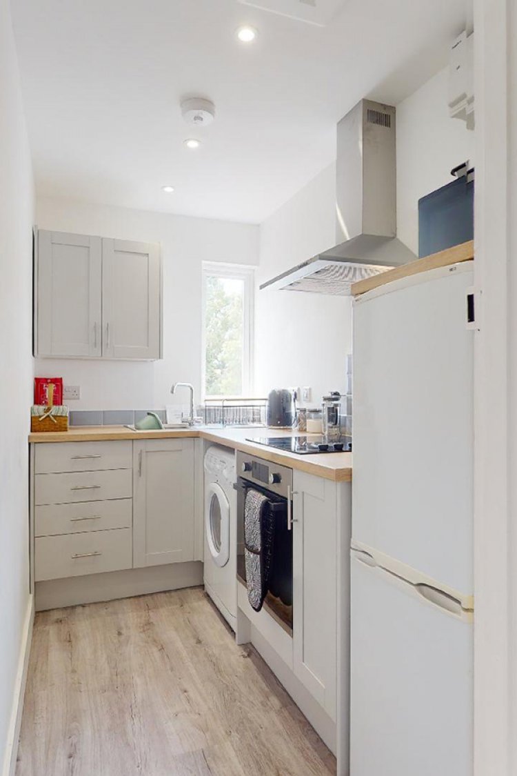 The kitchen is equipped with an electric oven and hob, freestanding fridge/freezer, washer/dryer, microwave and kettle.