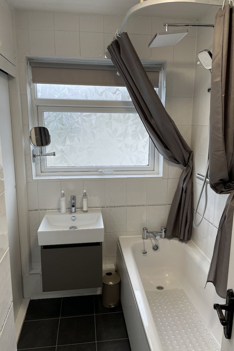 The bathroom is fully tiled with an electric shower over the bath, handbasin and a heated towel rail as well as a cupboard that houses the washing machine and tumble dryer. There is a separate toilet with a handbasin.