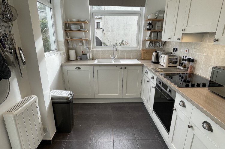 Through to the well-equipped kitchen with an electric oven with 4-ring hob, fridge/freezer, dishwasher and a microwave, kettle and toaster. A door leads to the rear open courtyard with small patio and seating.