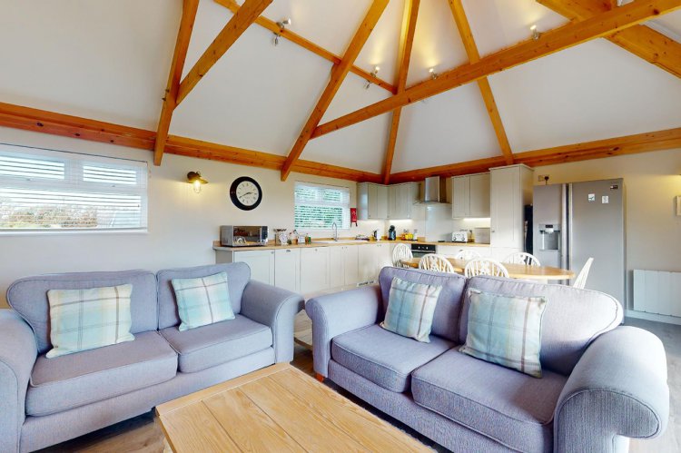 A spacious hallway runs the length of the cottage with all rooms off, inside the front door are hooks for coats and a boot rack for wellies. At one end of the cottage is a large open-plan kitchen, dining and living area. The kitchen is fully furnished with all that guests will need, including a microwave, oven, hob, American style fridge/freezer, washing machine, tumble dryer and dishwasher. A dining table with 6 chairs is set close to the sliding patio door, perfect for inviting in the fresh sea air or enjoying sunsets at dinnertime. The lounge area offers comfortable seating, Smart TV & DVD player and wireless internet is available throughout. From this room you can look out across the garden, over the field beyond and out to sea.